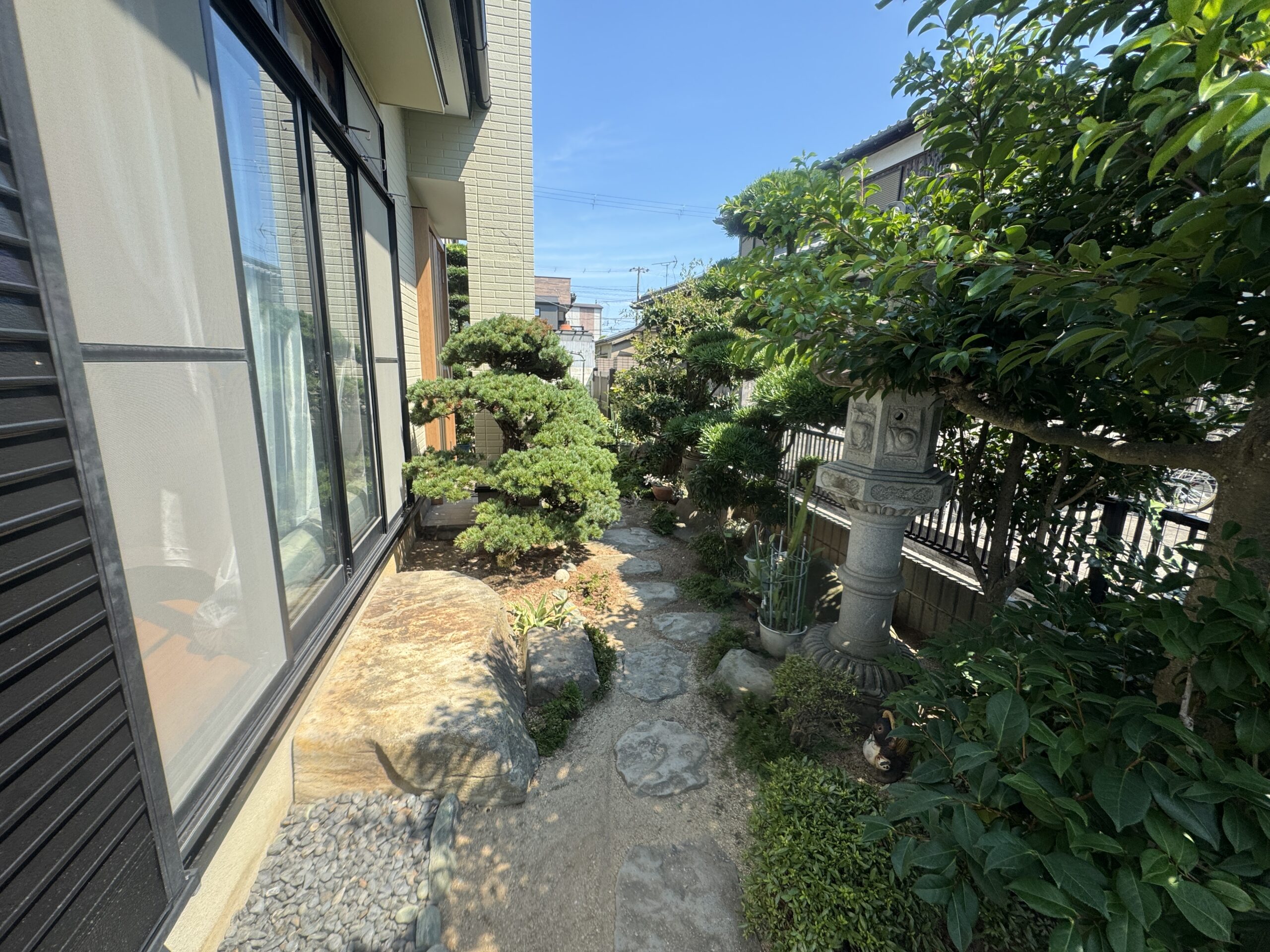 夜間や雨の日はつまずきやすく滑りやすかったりします。緑が多くて素敵ですが、木々が立派に育っている分窓からの視界を遮っていました。